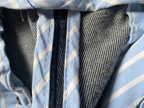 I hope this finds you well. For many years, I have wanted to own a garment from the design company Piazza Sempione. Twice I have found one of their garments in a thrift store. I loved the opportunity to admire their attention to detail. On my recent trip to Colorado, my friends and I wandered into a consignment shop, and there they were, Piazza Sempione jeans, in my size at 75% off the consignment price! As hoped, the jeans had wonderful detailing - all of the "small things" had been considered. Where I would usually expect to see a raw denim seam, the edges were finished with a striped cotton that matched the pocket lining. (photo) Also, the button on the inside of the waistband wasn't sewn directly on the fabric, rather on a "stem" that allows for movement. (photo) It is almost always the button that pops off of jeans, but not these ones! In thoughtfully considered craft it is the little things that add up to big things.